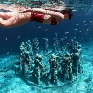 the Underwater NEST Statue resembling a human being of the same size and located about 13 feet from the surface of the beach is the work of Jason deCaires Taylor, He is a famous sculptor whose work has spread to England, the Caribbean, the Canary Islands and many more.